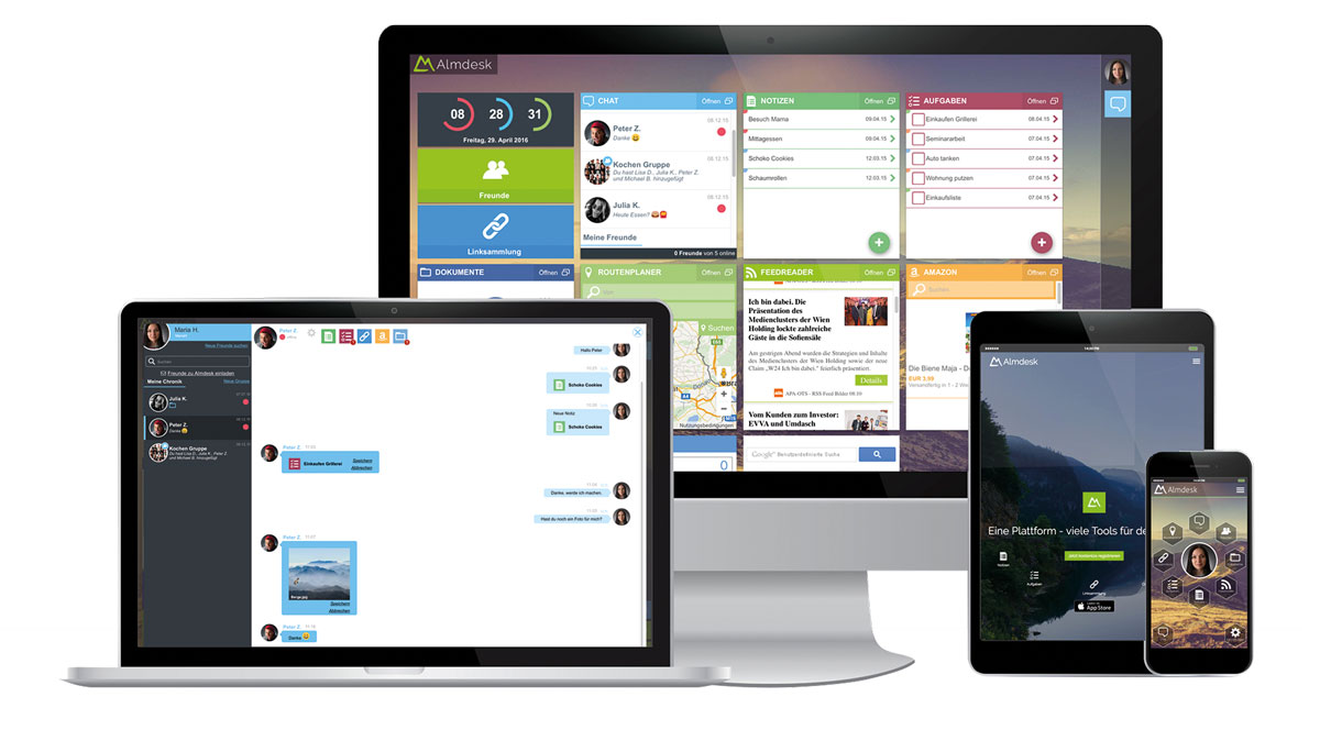 Almdesk ® ist eine innovative Online-Plattform, die mit ihrer Cloud-Technik und hohen Kompatibilität optimal geeignet ist, um Services schnell und unkompliziert über Widgets (in-Apps) an Kunden, Mitarbeiter oder Partner auszuliefern – über die gängigsten Geräte und Betriebssysteme.